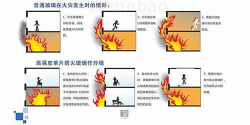 普通浮法玻璃遇火30秒炸裂,鋼化玻璃遇火1分鐘炸裂,不具備耐火完整性無法在一定時(shí)間內(nèi)阻擋火勢(shì)蔓延。而單片防火玻璃,遇火時(shí)在1000℃高溫下可堅(jiān)持30—120分鐘不炸裂,有效地限制火災(zāi)以及煙霧波及的范圍。